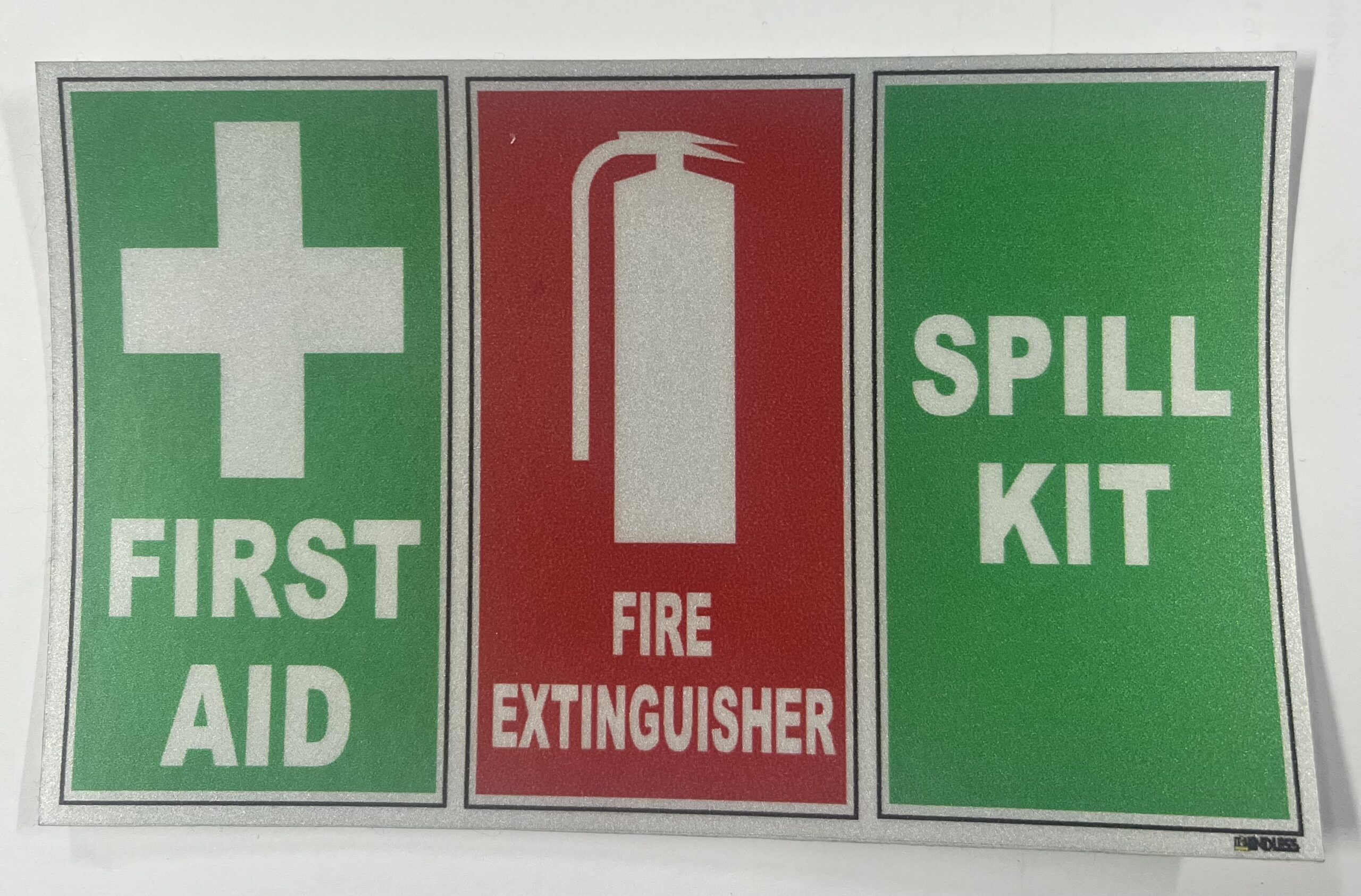 3 in 1 Safety Decal, First Aid, Fire Extinguisher, Spill Kit.